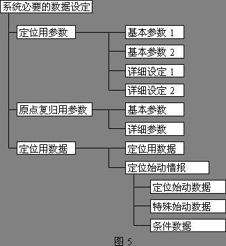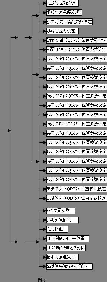 本系統(tǒng)采用的是A970GOT人機界面,在本系統(tǒng)中人機界面起了非常重要的角色,是其他任何器件都代替不了的。人機界面總共有218個畫面組成,主要分兩大部分:一是正常的操作人員操作的主畫面,二是設(shè)備維修、調(diào)試人員進入的特殊功能畫面,此畫面只有工程師級身份人員才能進入,它的參數(shù)直接影響設(shè)備的正常工作,圖6為特殊功能畫面的結(jié)構(gòu)圖,其中主要是參數(shù)設(shè)定方面,這里主要介紹軸的位置參數(shù)設(shè)定,在本系統(tǒng)中最主要的部分就是伺服系統(tǒng),它是保證系統(tǒng)精度的核心,伺服系統(tǒng)的參數(shù)、數(shù)據(jù)設(shè)定是非常復(fù)雜的,圖6為伺服系統(tǒng)參數(shù)設(shè)定的基本框架結(jié)構(gòu)圖,基本參數(shù)主要是單位設(shè)定、1脈沖的相當(dāng)移動量、脈沖輸出模式、轉(zhuǎn)動方向、速度限制值、加減速時間、馬達選擇。詳細設(shè)定除了對上面敘述中一些進行了詳細設(shè)定以外,還對其他的功能進行了設(shè)定,如M代碼的取碼模式、速度模式、JOG運轉(zhuǎn)、手動脈沖的選擇、圓弧誤差補正等等。原點復(fù)位參數(shù)設(shè)定主要是復(fù)歸的方式、方向、原點地址、速度。定位用數(shù)據(jù)就是我們所要求系統(tǒng)如何去工作、工作的步驟、數(shù)據(jù)等內(nèi)容。伺服系統(tǒng)的工作主要是對內(nèi)部寄存器的地址進行操作,主要分為參數(shù)區(qū)、監(jiān)視區(qū)、制御數(shù)據(jù)區(qū)、定位數(shù)據(jù)區(qū)、PLC的CPU內(nèi)存區(qū)、塊傳送區(qū)幾個部分。在圖5系統(tǒng)圖中對各個位置的設(shè)定(QD75)主要是對基本定位數(shù)據(jù)的設(shè)定,包括定位識別子、M代碼、指令速度、定位地址/移動量、突停減速時間、圓弧地址,其中每軸共設(shè)定了30點位置,這樣可以有效的適應(yīng)系統(tǒng)切割復(fù)雜程度不同的基板。在人機界面的軟件設(shè)計中,把與伺服系統(tǒng)相關(guān)的定位數(shù)據(jù)參數(shù)直接編寫在畫面中,可以有效的對系統(tǒng)進行調(diào)整,改變,在系統(tǒng)中不僅僅上面的這些數(shù)據(jù),另外與定位有關(guān)的參數(shù)設(shè)定還有很多,在這里就不一一列舉,本系統(tǒng)是一個非常復(fù)雜的系統(tǒng)。