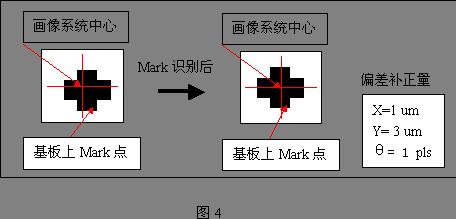 圖3是本系統(tǒng)整個控制系統(tǒng)的原理圖,本系統(tǒng)采用Q06H CPU為控制單元,QD75D4和QD75D2為伺服系統(tǒng)的定位單元,還采用了兩個QJ74C24通訊模塊單元,其中一個與人機界面(A970GOT)連接,另外一個和畫像處理系統(tǒng)連接,畫像系統(tǒng)主要用于Mark點(也就是標(biāo)記點)的識別,然后產(chǎn)生一個偏差的補正值。另外與QJ74C24相連接的PC1機是系統(tǒng)機械參數(shù)、工作參數(shù)設(shè)定以及切斷程序編制的專用機。PC1與PLC之間的通訊使用的是專門的通訊程序軟件。本系統(tǒng)的工作方式是采用偏差補正的方式。對于一個新的品種,首先要進行Mark點的識別,登錄,MARK點的形狀可以隨意,但一般采用的是’十’字為Mark點標(biāo)記,如圖4所示,就是畫像處理系統(tǒng)對Mark點的認識過程,認識后產(chǎn)生一個偏差補正量,根據(jù)偏差量計算出基準(zhǔn)位置。