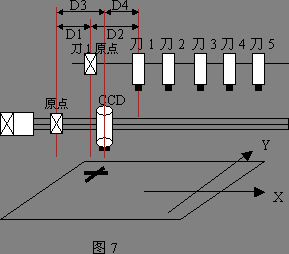 系統(tǒng)在機械參數(shù)設(shè)定好后,首先根據(jù)基板的劃線數(shù)據(jù)進行編程,確定劃線的數(shù)據(jù)、MARK點的數(shù)據(jù)、使用刀的數(shù)量、每把刀劃每條線的壓力、劃線的次數(shù)等, 以上參數(shù)有專門的軟件進行編輯。編輯完成后再通過PC1輸入PLC 的CPU,在完成數(shù)據(jù)的編輯后,軟件回自動生成切割的模擬畫面,確定基板劃線的每一步由哪幾把刀去做,在完成這一系列的工作后,就要放入基板試作劃線,根據(jù)系統(tǒng)設(shè)定,在放入基板后按下啟動按鈕,基板平臺會自動把基板送到影像處理系統(tǒng)的CCD的下面,在監(jiān)視器上面看到的就如圖4所示,在MARK識別中與系統(tǒng)設(shè)定會有一個的偏差,根據(jù)這個偏差系統(tǒng)進行補正,現(xiàn)介紹一下補正過程,如圖7, 以第一把刀為例,刀1原點與CCD原點的X向距離D1在系統(tǒng)中設(shè)定為一定值,刀1與刀1原點的距離D2為在編制程序是產(chǎn)生,也為一定值,CCD原點與現(xiàn)在CCD之間的距離D3,在編制程序時有一個MARK的坐標(biāo)值,D3即為基板的X向MARK坐標(biāo),D4為MARK點與刀1劃基板第一道線X向距離,在理想狀態(tài)下為一定值。即可以得出D1+D2=D3+D4,其中D1、D2為固定值,假設(shè)D5為CCD識別MARK點的動態(tài)坐標(biāo),偏差補正為△d,可以得出D5=D3±△d,如在理想狀態(tài),CCD識別MARK點的X向坐標(biāo)剛好為D3,即D5=D3,而每塊基板在放置的時候位置絕對會不一樣,所以都會有一個偏差△d,根據(jù)△d每次在CCD識別MARK點后向刀1移動的距離為D4±△d,這就是偏差補正的過程,其他的刀原理也是這樣,在偏轉(zhuǎn)劃線時也是根據(jù)CCD第一次MARK識別的坐標(biāo)了確定的。在劃完了TFT面后,在 CF面對TFT面進行剖斷,然后在CF面劃線,再在TFT面對CF進行剖斷,這樣就完成了對基板的劃線。
