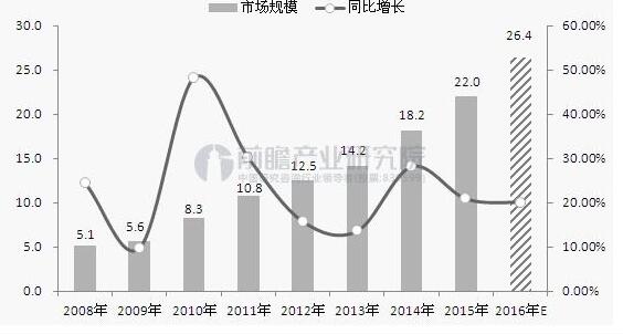 2008-2016年我國機器視覺行業市場規模及增長率(單位:億元,%)